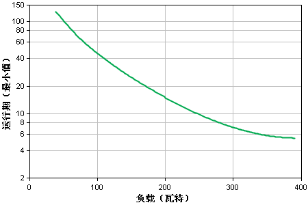 曲線擬合測(cè)得的運(yùn)行時(shí)間數(shù)據(jù)。 所有測(cè)量都是在使用充滿(mǎn)電的新電池、在典型環(huán)境條件下且沒(méi)有電力輸入和電阻負(fù)載輸出的情況下開(kāi)展的。