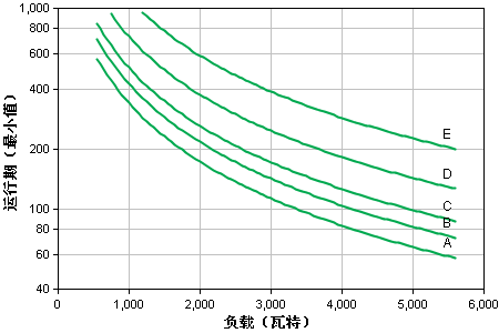 曲線擬合測(cè)得的運(yùn)行時(shí)間數(shù)據(jù)。 所有測(cè)量都是在使用充滿電的新電池、在典型環(huán)境條件下且沒(méi)有電力輸入和電阻負(fù)載輸出的情況下開(kāi)展的。 |