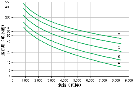 曲線擬合測(cè)得的運(yùn)行時(shí)間數(shù)據(jù)。 所有測(cè)量都是在使用充滿電的新電池、在典型環(huán)境條件下且沒(méi)有電力輸入和電阻負(fù)載輸出的情況下開展的。 |
